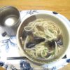 冷凍のお好み焼き、きゅうりとワカメとカニカマの酢の物、即席味噌汁、この後ヨーグルト。