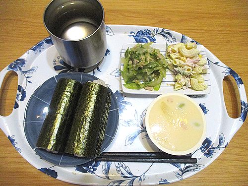 とろサーモン巻&ねぎとろ巻、無限セロリ、マカロニサラダ、茶わん蒸し、この後ヨーグルト。