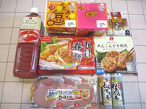 トマトジュース、納豆2P、ちくわ、冷凍食品2種(五目春巻、れんこんひき肉天)、3連ロースハム、とろサーモン巻、ねぎとろ巻、それとミネラルウォーター1箱で税込み1682円でした。