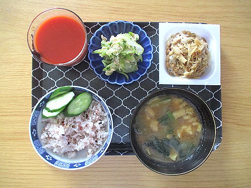 無限セロリ、きゅうりのぬか漬け、なめ茸入り納豆、玉ねぎと小松菜と油揚げの味噌汁、トマトジュース。