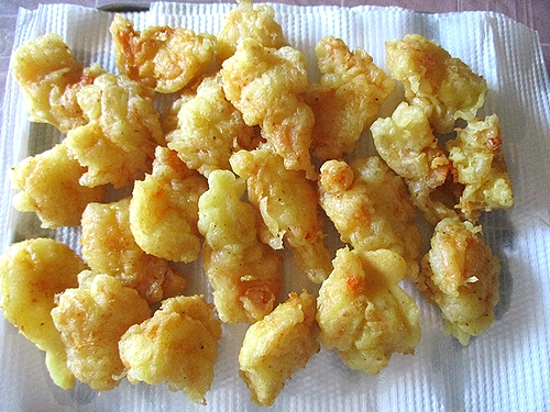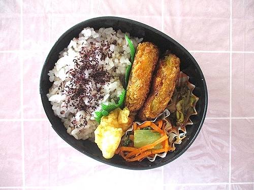 かぼちゃコロッケ、えび天、チンゲンサイと人参の胡麻和え、ブロッコリーの芯のバター醬油炒め。