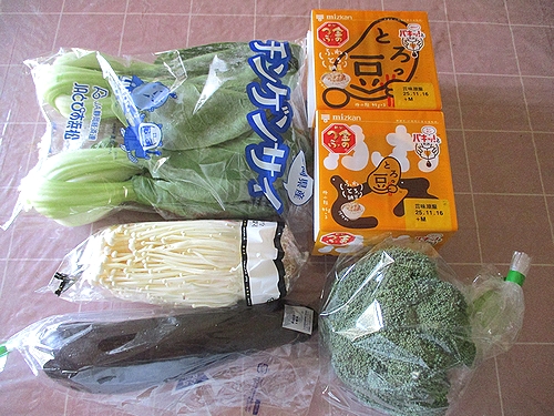 チンゲンサイ、えのき茸、茄子、ブロッコリー、納豆2P、以上で税込み757円でした。