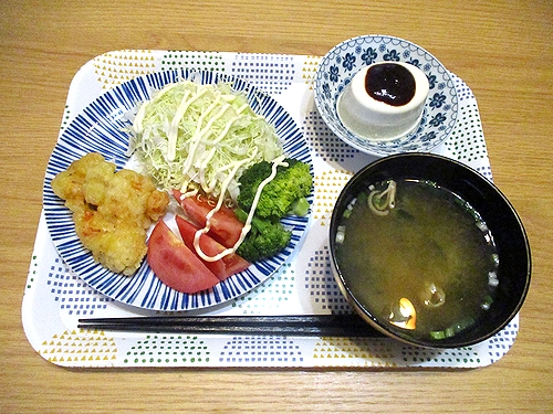 えび天、キャベツ&ブロッコリー&トマト、冷奴、即席味噌汁、この後ヨーグルト。