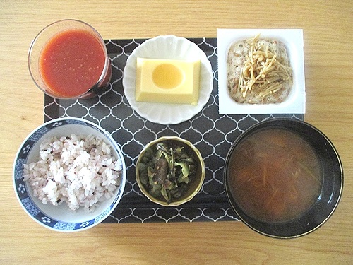 玉子豆腐、きゅうりと茄子の塩もみ、なめ茸入り納豆、水菜とえのきと油揚げの味噌汁、トマトジュース。