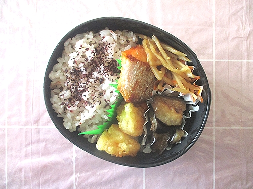 鮭の塩焼き、えび天、きんぴらごぼう、なす南蛮。