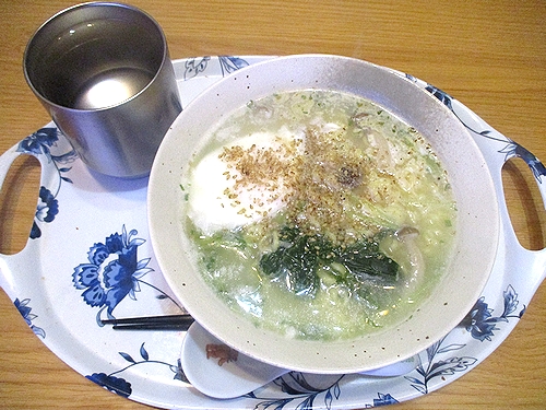 水菜、しめじ、玉子入りサッポロ一番塩とんこつラーメン、この後ヨーグルト。