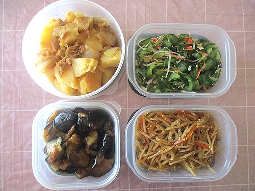ツナじゃが玉ねぎのうま煮、きゅうりとワカメとカニカマの酢の物、なす南蛮、きんぴらごぼう。
