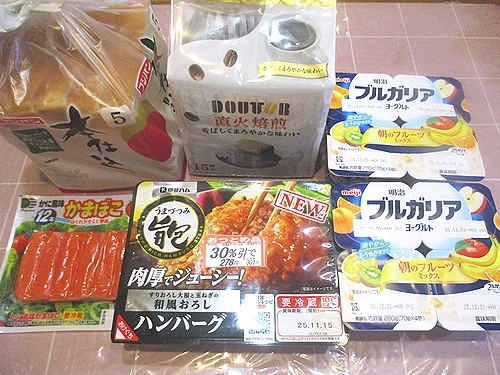 食パン、ドリップコーヒー、カニカマ、和風おろしハンバーグ、ヨーグルト2P、以上で税込み1266円でした。
