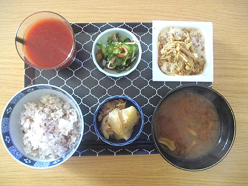 きゅうりとワカメとカニカマの酢の物、ツナじゃが玉ねぎのうま煮、なめ茸入り納豆、玉ねぎとしめじと油揚げの味噌汁、トマトジュース。