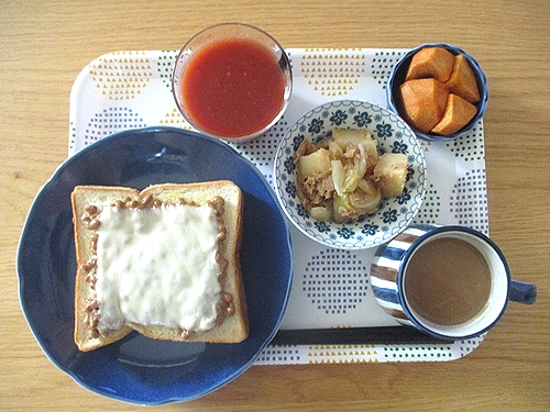 納豆チーズトースト、ツナじゃが玉ねぎのうま煮、柿、カフェオレ、トマトジュース。