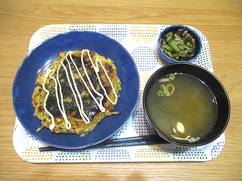 冷凍のお好み焼き、きゅうりとワカメとカニカマの酢の物、即席味噌汁、この後ヨーグルト。