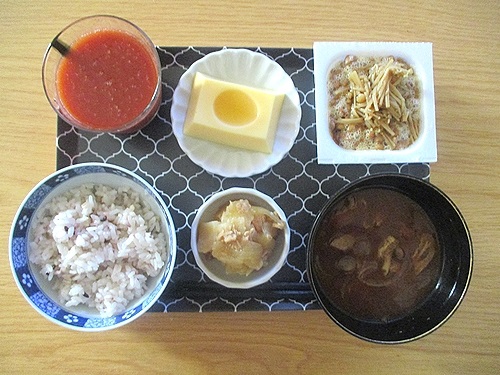 玉子豆腐、ツナじゃが玉ねぎのうま煮、なめ茸入り納豆、玉ねぎとしめじと油揚げの味噌汁、トマトジュース。