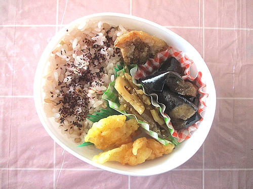 サバの竜田揚げ、えび天、なす南蛮、きんぴらごぼう。