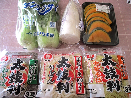 チンゲンサイ、カット大根、スライスかぼちゃ、3個入り蕎麦、3個入りうどん、3個入り中華そば、以上で税込み640円なり~。