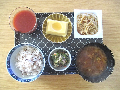 玉子豆腐、きゅうりとワカメとカニカマの酢の物、なめ茸入り納豆、玉ねぎとしめじと油揚げの味噌汁、トマトジュース。