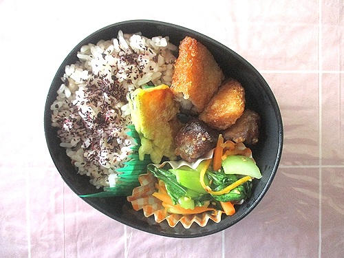 白身魚フライ、かぼちゃ天、エリンギの唐揚げ、チンゲンサイと人参の胡麻和え。