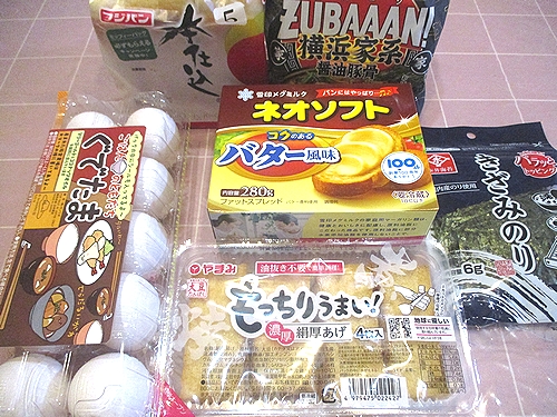 食パン、インスタントラーメンのZUBAAAN、卵、マーガリン、厚揚げ、刻みのり、以上で税込み1211円なり~。
