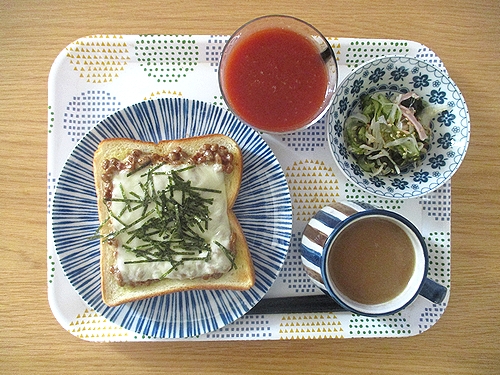 納豆チーズトースト、きゅうりと玉ねぎとワカメとカニカマの酢の物、カフェオレ、トマトジュース。