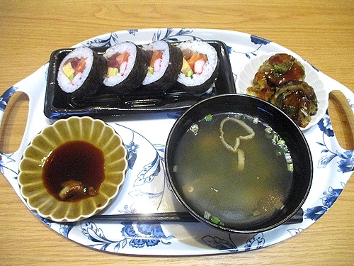 海鮮太巻、茄子のはさみ揚げ、即席味噌汁、この後ヨーグルト。