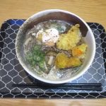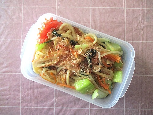 もやし、ちくわ、チンゲンサイと人参の胡麻和え入り焼きうどん。