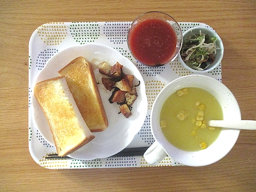トースト、じゃがいもの塩昆布バター炒め、きゅうりと玉ねぎとワカメとカニカマの酢の物、コーンクリームスープ、トマトジュース。