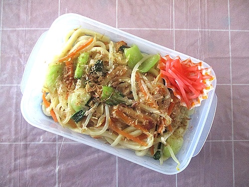 ちくわ、もやし、チンゲンサイと人参の胡麻和え入り焼きうどん。