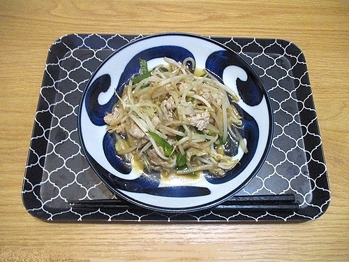 豚肉、もやし、ピーマン、椎茸、しめじの炒め物、この後ヨーグルト。