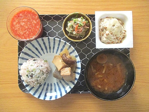 おにぎり、厚揚げの煮物、きゅうりと玉ねぎとワカメとカニカマの酢の物、納豆、玉ねぎとしめじと油揚げの味噌汁、トマトジュース。