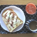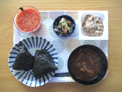 おにぎり(しぐれ、梅)、きゅうりと玉ねぎとワカメとカニカマの酢の物、納豆、玉ねぎとえのきと油揚げの味噌汁、トマトジュース。