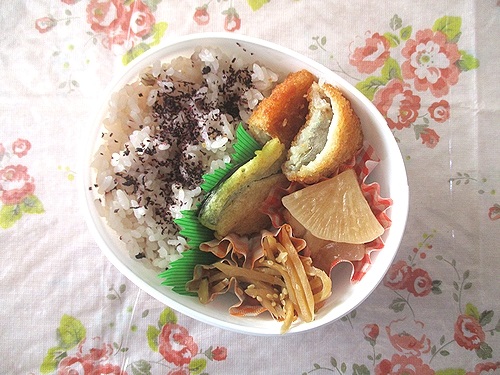 白身魚フライ、かぼちゃ天、厚揚げの煮物、きんぴらごぼう。