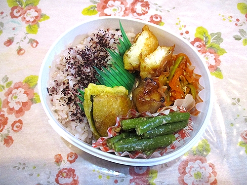 赤魚の天ぷら、かぼちゃ天、エリンギの唐揚げ、ブロッコリーの茎のきんぴら、いんげんのアーモンド和え。