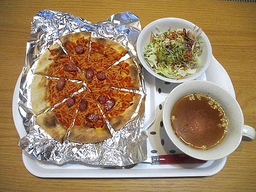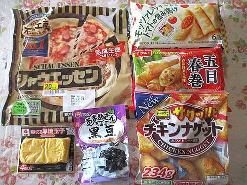 ピザ、冷凍食品(チーズとトマトの包み揚げ、五目春巻)、チキンナゲット、厚焼玉子、黒豆、以上で税込み1088円なり~。