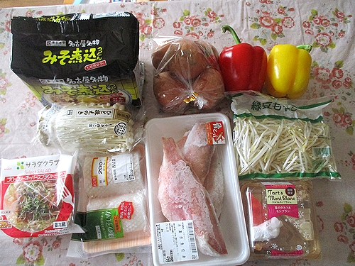 寿がきや味噌煮込みうどん、玉ねぎ、パプリカ2個、えのき茸、ミックスサラダ、冷凍イカ、赤魚3切、もやし、ケーキ、以上で税込み2284円でした。