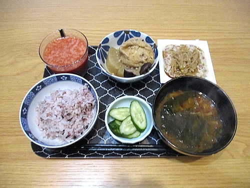 大根と椎茸とがんもの煮物、きゅうりのぬか漬け、なめ茸入り納豆、玉ねぎとワカメと油揚げの味噌汁、トマトジュース。