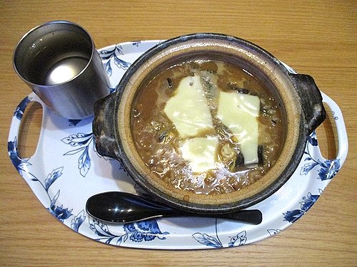 薄めた朝の味噌汁になす南蛮と玉子とチーズを入れた雑炊、この後ヨーグルト。
