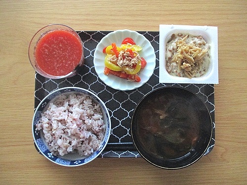 パプリカとツナのマリネ、なめ茸入り納豆、玉ねぎとワカメと油揚げの味噌汁、トマトジュース。