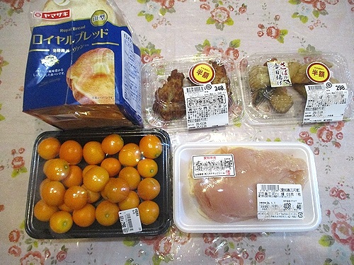 食パン、チキンの炙り焼き、サバの竜田揚げ、金柑、鶏むね肉、以上で税込み1150円でした。