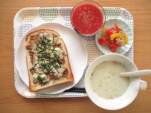 納豆チーズトースト、パプリカとツナのマリネ、ポタージュスープ、トマトジュース。