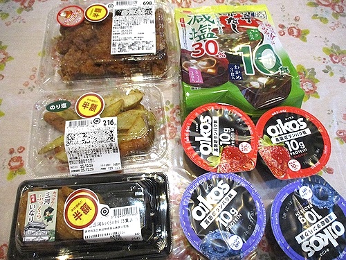 半額のいなり寿司とウイウンナー&ポテトと3個入り骨なしチキン、オイコス4P、即席味噌汁、以上で1385円でした。