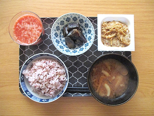 なす南蛮、なめ茸入り納豆、玉ねぎとしめじと油揚げの味噌汁、トマトジュース。