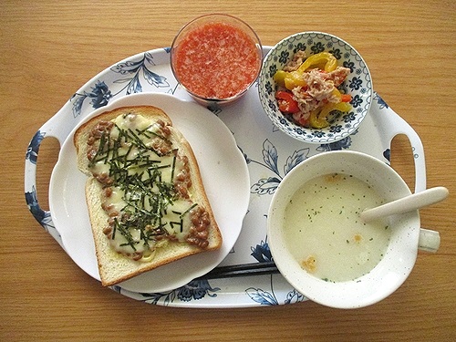 納豆チーズトースト、パプリカとツナのマリネ、ポタージュスープ、トマトジュース。