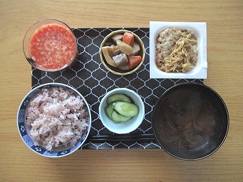 筑前煮、きゅうりのぬか漬け、なめ茸入り納豆、玉ねぎと茄子とワカメの味噌汁、トマトジュース。