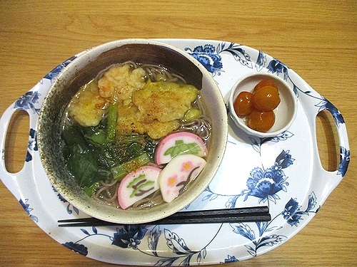 えび天、かぼちゃ天、蒲鉾、小松菜入り蕎麦、金柑の甘露煮、この後ヨーグルトとみかん。