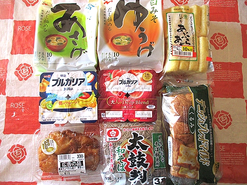 即席味噌汁2種、油揚げ、ヨーグルト2P、カレイの唐揚げ、3個入り蕎麦、食パン、以上で税込み1584円でした。