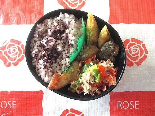 サバの竜田揚げ、エリンギの唐揚げ、五目春巻、パプリカとツナのマリネ。