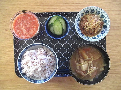 豚汁、きゅうりのぬか漬け、なめ茸入り納豆、トマトジュース。