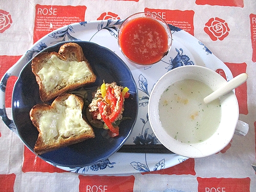 チーズトースト、パプリカとツナのマリネ、ポタージュスープ、トマトジュース。