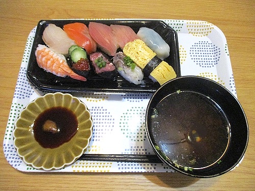 握り寿司、即席味噌汁、この後みかん。