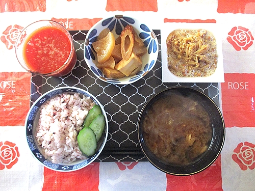 大根と厚揚げとちくわの煮物、きゅうりのぬか漬け、なめ茸入り納豆、玉ねぎと茄子と油揚げの味噌汁、トマトジュース。