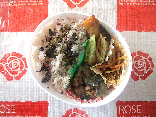 サバの竜田揚げ、五目春巻、茄子と大豆ミートの甘酢炒め、きんぴらごぼう。